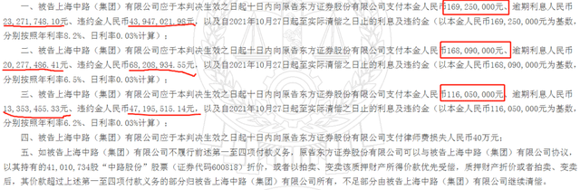 据中国裁判文书网,陈荣的中路集团要给东方证券三项本金16925万、16809万、11605万。再加上利息5690万、违约金15935万和40万律师费,陈荣一共要偿付6.7亿元。