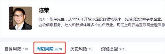 目前,天眼查上看,陈荣的自身风险有110条,周边风险已经9970条之多,光是名下的失信且限制高消费的公司就有19家。