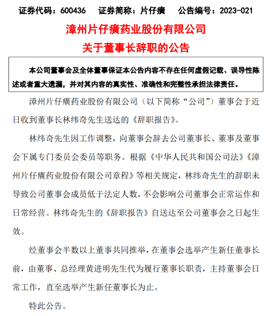 片仔癀7月24日晚公告,董事会于近日收到董事长林纬奇送达的《辞职报告》。林纬奇因工作调整,向董事会辞去公司董事长、董事及董事会下属专门委员会委员等职务。