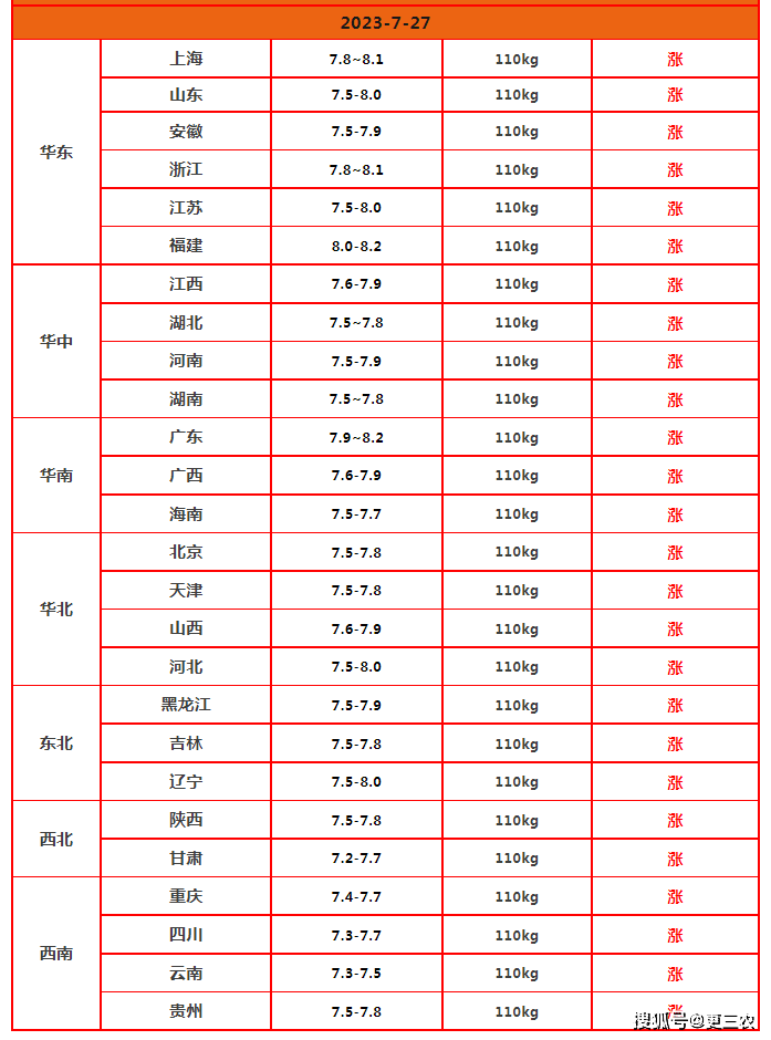 具体分析,在全国7个生猪产区,在传统高低市场,目前,东北黑吉辽地区,生猪出栏报价涨至7.5~8元/斤,辽宁部分高价猪源涨至8元/斤。在华北市场,山西以及河北涨至7.5~8元/斤。在西北陕甘地区,屠企报价冲高7.2~7.8元/斤。而在南方市场,目前,西南地区,屠企报价7.3~7.8元/斤;华东地区,生猪报价涨至7.5~8.2元/斤。而在华中地区,屠企报价涨至7.5~7.9元/斤;华南市场,生猪报价涨至7.5~8.2元/斤!