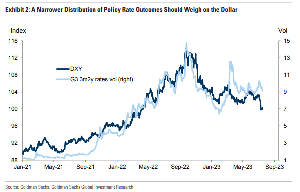 进一步来看,这缩小了核心利率结果的分布,减少了右尾情景(利率上升)的可能性,并缓和了利率的波动,对美元构成压力,并削弱其相对于对利率更敏感的货币上行空间,使之更倾向于左尾情景(利率下降)。