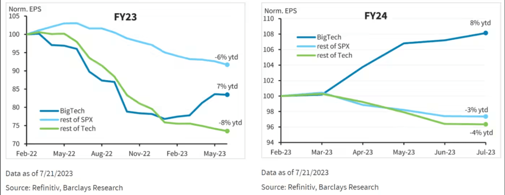 过去25年里,我们只看到过两次年初至今的倍数上涨——分别是2009年和2020年。这两年都经历了深度衰退和大规模宽松政策,这支持了估值应该在(最终)长期反弹之前扩张的观点。但这并不能解释2023年的情况。