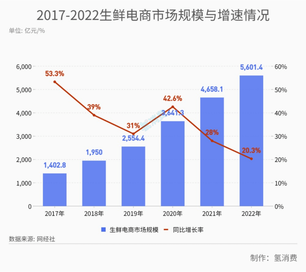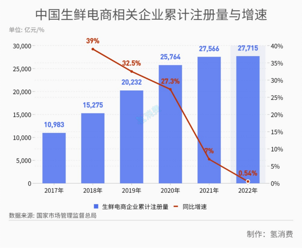 生鲜电商经过“大浪淘沙”,目前赛道上的选手变少,但市场空间却变大了。据网经社的数据,2022年生鲜电商市场规模约5601.4亿元,同比增长20.3%。但据国家市场监督管理总局,2022年生鲜电商相关企业为27715家,相较于2021年的27566家,仅仅增加了0.54%。