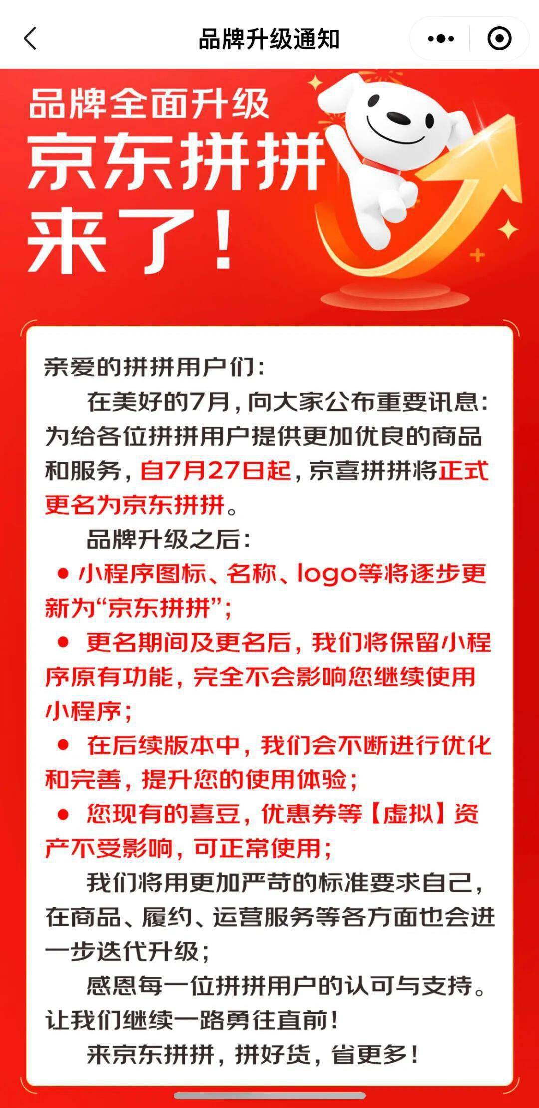近日,京东社区团购业务排头兵“京喜拼拼”发布品牌升级公告。公告称,自7月27日起,京喜拼拼将正式更名为京东拼拼。京喜拼拼表示,品牌升级后将用更加严苛的标准要求自己,在商品、履约、运营服务等各方面也会进行迭代升级。