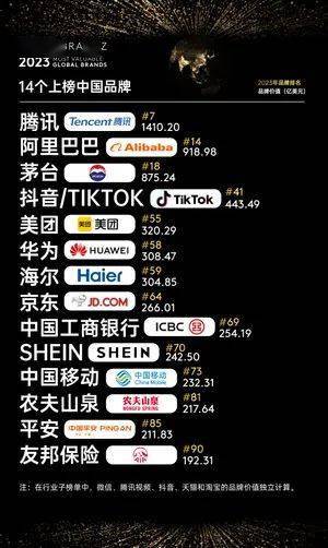 当然,也有14家中国公司出现在列表中,比如腾讯、阿里巴巴、抖音等。 今年的品牌排行榜究竟有哪些亮点呢?我们一起来看看。