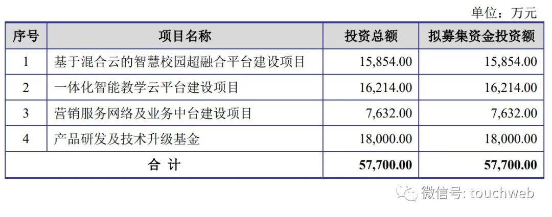 金智教育计划募资5.77亿,其中,1.59亿用于基于混合云的智慧校园超融合平台建设,1.62亿用于一体化智能教学云平台建设项目,7632万用于营销服务网络及业务中台建设项目,1.8亿用于产品研发及技术升级基金。