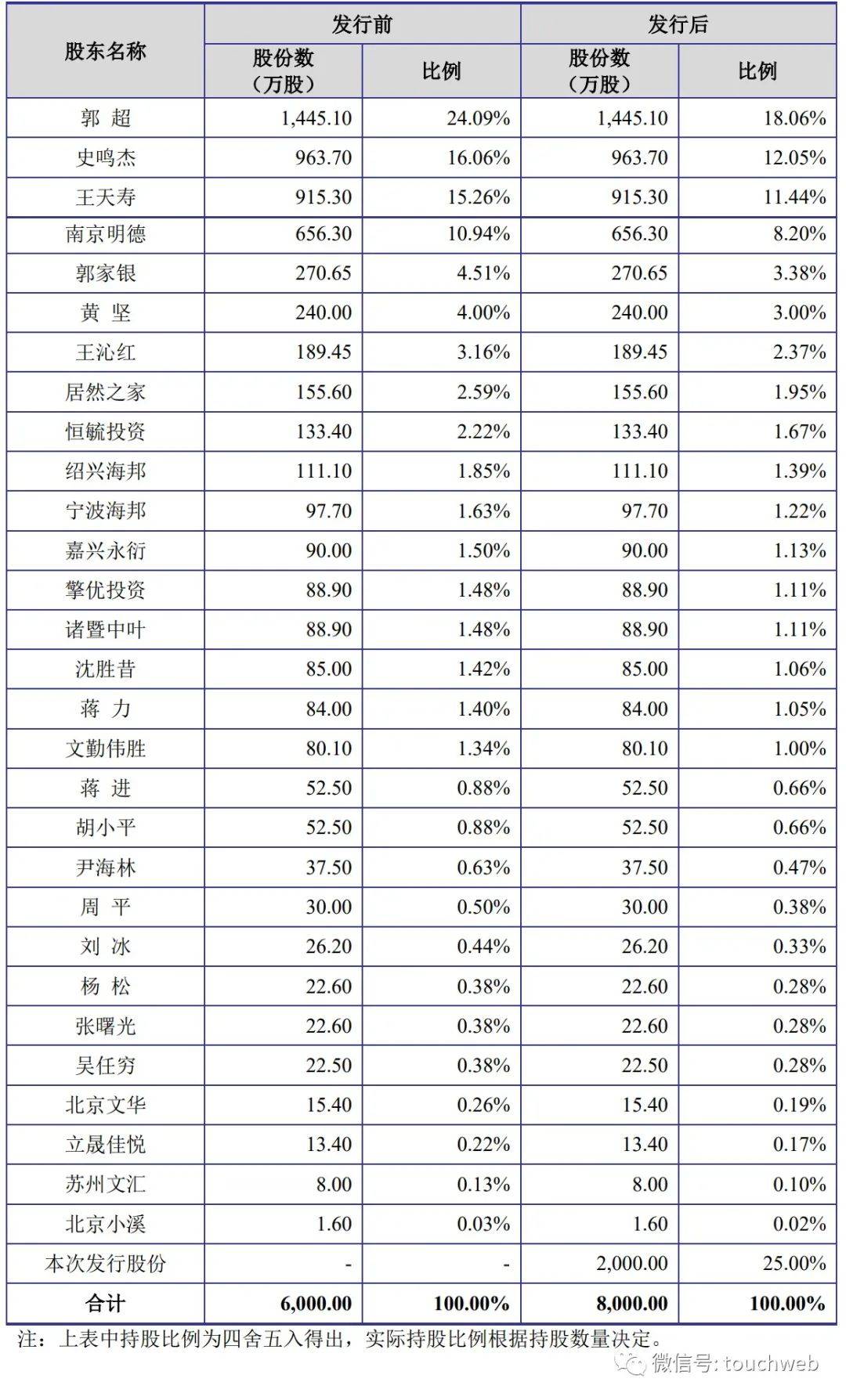 IPO后,郭超直接持股为18.06%,史鸣杰持股为12.05%,王天寿持股为11.44%,南京明德持股为8.2%,郭家银持股为3.38%,黄坚持股为3%,王沁红持股为2.37%,居然之家持股为1.95%,恒毓投资持股为1.67%,绍兴海邦持股为1.39%,宁波海邦持股为1.22%,嘉兴永衍持股为1.13%,擎优投资、诸暨中叶分别持股为1.11%。