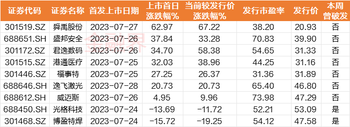 本周9只新股上市交易,目前A股共计5241家上市公司。从新股上市首日收盘涨幅表现来看,未出现单日翻倍的新股,舜禹股份最为出色,收涨67.22%,盛邦安全、君逸数码、港通医疗均涨超30%,福事特、逸飞激光涨逾20%,威迈斯则小幅收涨,光格科技、博盈特焊双双遭遇破发。