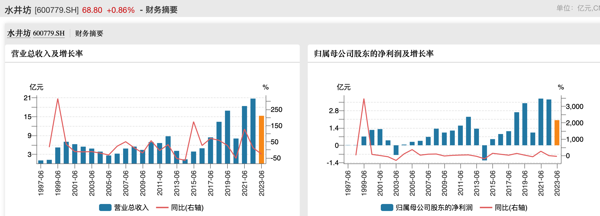 水井坊近20年上半年业绩情况。来源于wind