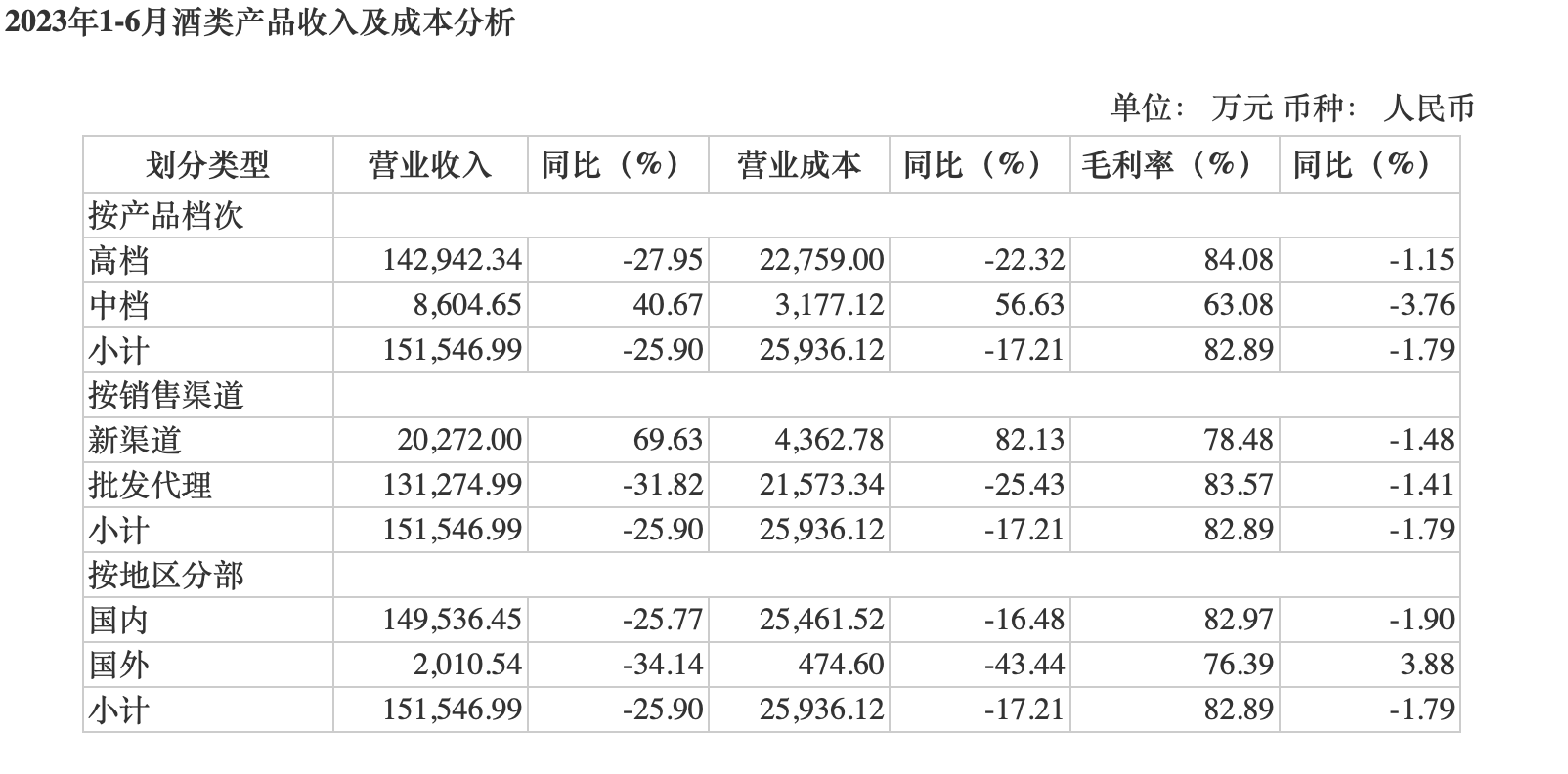 具体来看,按产品档次分类,上半年高档酒类产品实现营收14.29亿元,同比下降27.95%,毛利率为84.08%,同比下降1.15%;中档酒类产品实现营收8604.65万元,同比增长40.67%,毛利率为63.08%,同比下降3.76%。按销售渠道分类,新渠道实现营收2.03亿元,同比增长69.63%,批发代理渠道实现营收13.13亿元,同比下降31.82%。