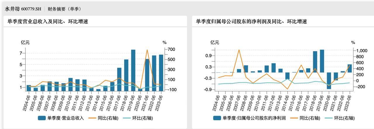 水井坊近20年二季度业绩情况。来源于wind