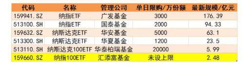 记者注意到,本周纳指ETF也在吸金前列,Wind 数据显示,今年以来,纳指相关ETF最高涨近45%,今年初以来合计吸金超60亿元。值得注意的是,广发、国泰、华安、华夏等多家基金公司纷纷就旗下产品开启限购,目前仅汇添富纳指ETF未设上限。