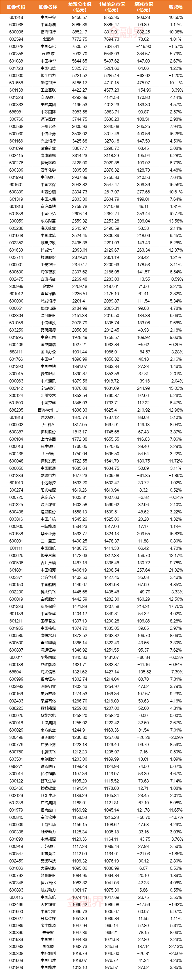 与前一周五收盘时比较,从市值增减金额来看,近两周的千亿市值公司中,中国人寿市值一周暴涨1353.88亿元,中国平安、招商银行市值也分别大增903.23亿元、832.25亿元,中信证券周五涨停,本周市值增长490.56亿元,邮储银行市值增长475.97亿元,中国太保、五粮液、宁德时代、东方财富酒均增长逾300亿元,山西汾酒总市值增长超277亿元。