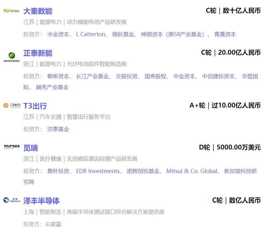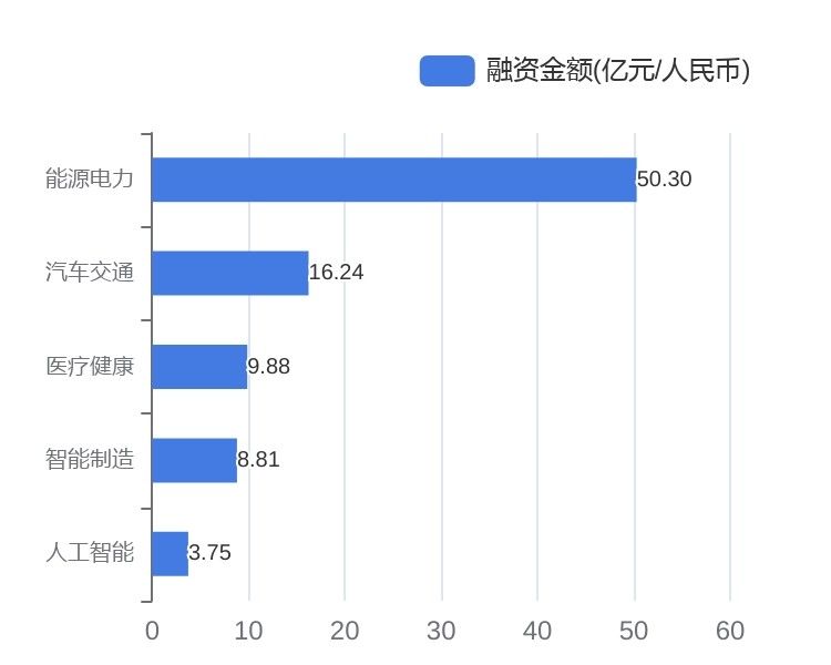 从已披露金额事件的融资规模来看,能源电力最高,融资总规模约为50.30亿元人民币。其中动力储能电池产品研发商 「大秦数能」 获数十亿人民币 C轮融资。