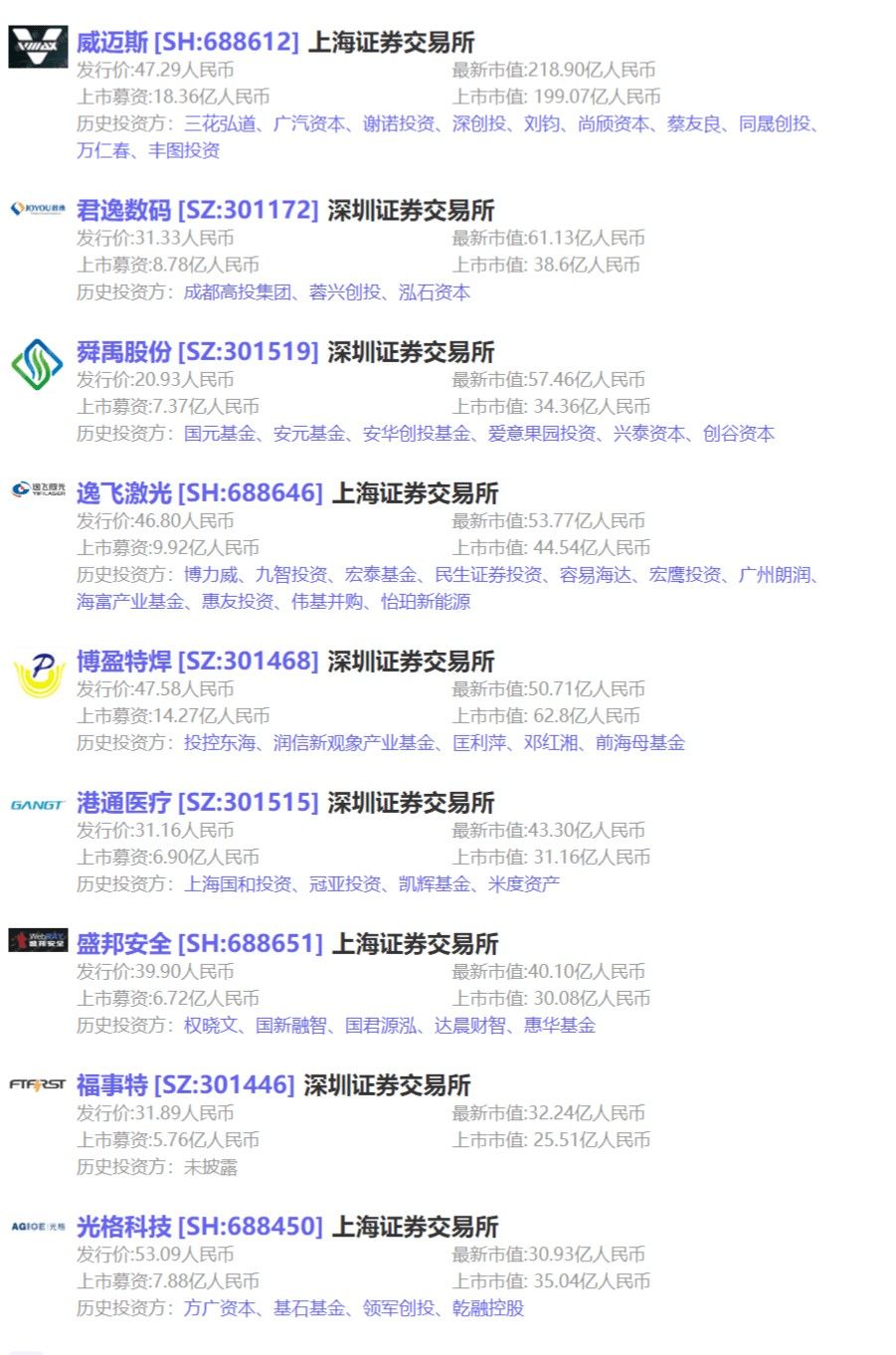 9家上市公司中,有8家曾获VC/PE或CVC投资,其中「威迈斯」曾获深创投、尚颀资本、广汽资本投资;「舜禹股份」曾获安元基金、创谷资本、兴泰资本投资;「逸飞激光」曾获惠友投资、海富产业基金、九智投资投资。