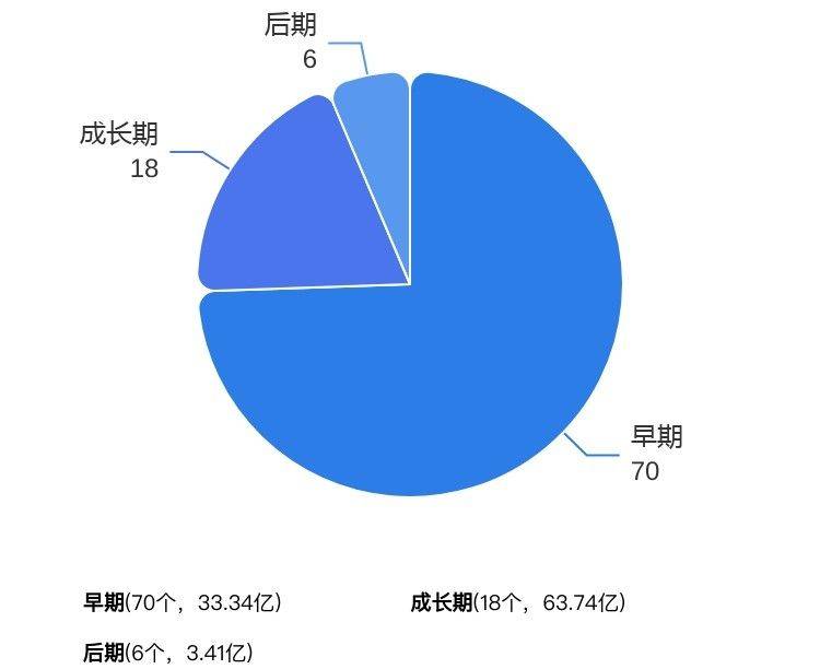 从本周披露获投企业的阶段分布来看, 早期70个、成长期18个、后期6个。