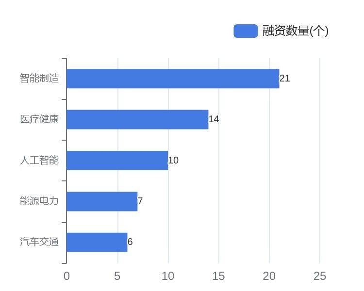 从融资事件数量来看,本周智能制造、医疗健康、人工智能领域融资最活跃。分别为智能制造21个、医疗健康14个、人工智能10个。