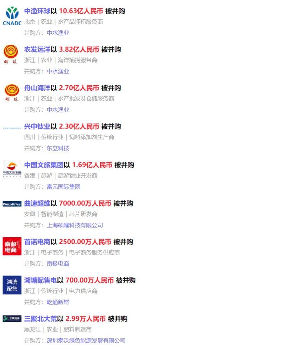 本周国内披露已完成的并购事件11个,与上周相比减少6个,分布在农业、物流仓储、传统行业行业。其中,中水渔业以10.63亿人民币收购水产品捕捞服务商中渔环球51%股份。被收购方中渔环球是一家水产品捕捞服务商,公司主要从事远洋捕捞、食品加工、渔业服务和水产品贸易四大业务板块,致力于打造完整的渔业产业链。