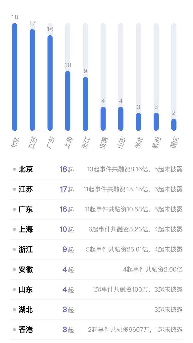 从本周披露获投企业的地区分布来看,主要集中在北京、江苏、广东。其中北京披露18个,江苏披露17个,广东披露16个。