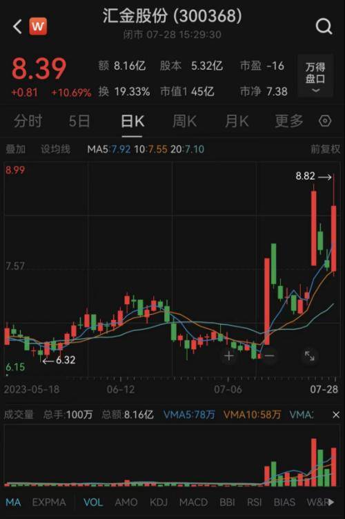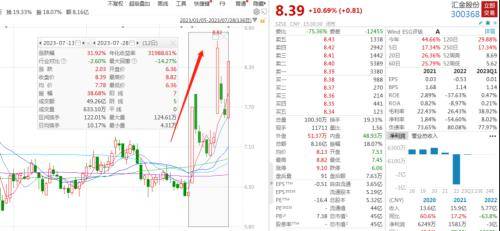 截至7月28日收盘,汇金股份每股报8.39元,涨幅10.69%,最新市值45亿元。