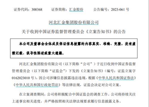 汇金股份表示,在立案调查期间,公司将积极配合中国证监会的调查工作。公司将持续关注上述事宜相关进度,并严格按照相关法律法规要求履行信息披露义务。
