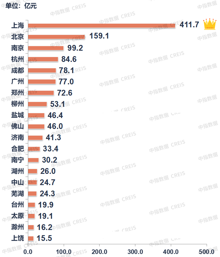榜单总额同比降近六成,长三角城市占据榜单九席。一线城市收金占比近半,且上海揽金近412亿领跑榜单。