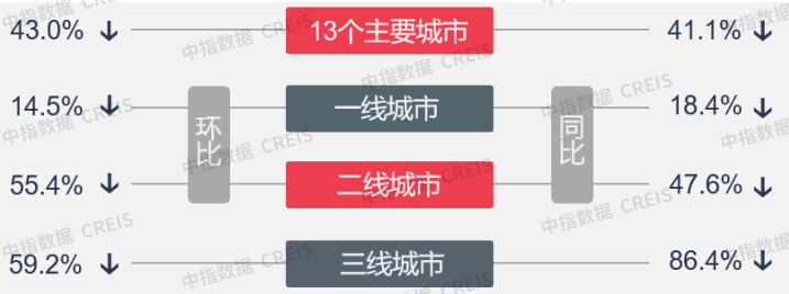 一线城市供应量同比降近六成,成交方面量价齐跌,出让金总额降近四成;二线城市供求同比下滑,成交量降近六成,出让金总额降近七成;三四线城市供应量同比走低,成交均价增近一成,出让金总额降幅近半。