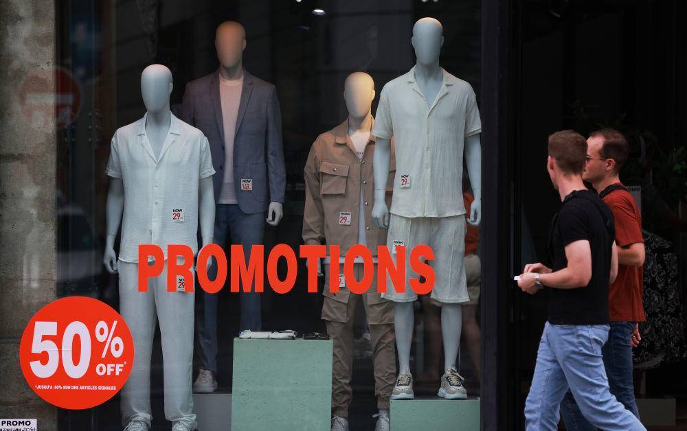 6月28日,人们走过法国巴黎街头的打折季广告。(新华社记者高静摄)