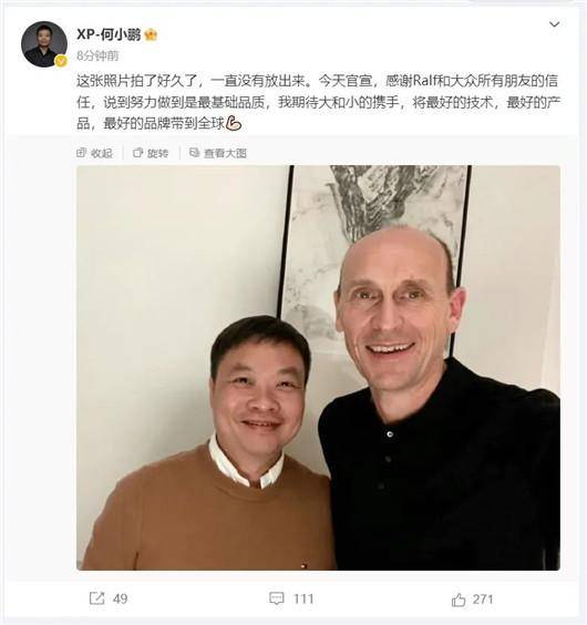 而官宣这场史诗级大事件往往采取最朴素的方式,那就是社交媒体发张合照,7月26日晚间,何小鹏在发了一张和大众汽车集团(中国)董事长兼CEO贝瑞德的合照。两个人的脸上都洋溢着赚到了的笑容。