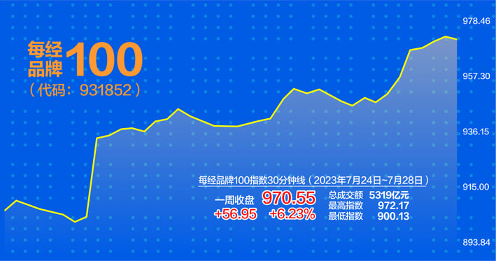 在诸多利好叠加下,各大权重板块上周共舞,地产、券商、银行、保险等板块强势上涨,带动了股指强劲反弹,每经品牌100指数更是奋勇当先,上涨6.23%,剑指千点大关,领涨A股三大股指。