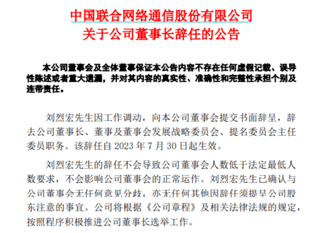 中国联通称,刘烈宏因工作调动,向董事会提交书面辞呈,其辞任自2023年7月30日生效。公司将按照程序,积极推进董事长选举工作。