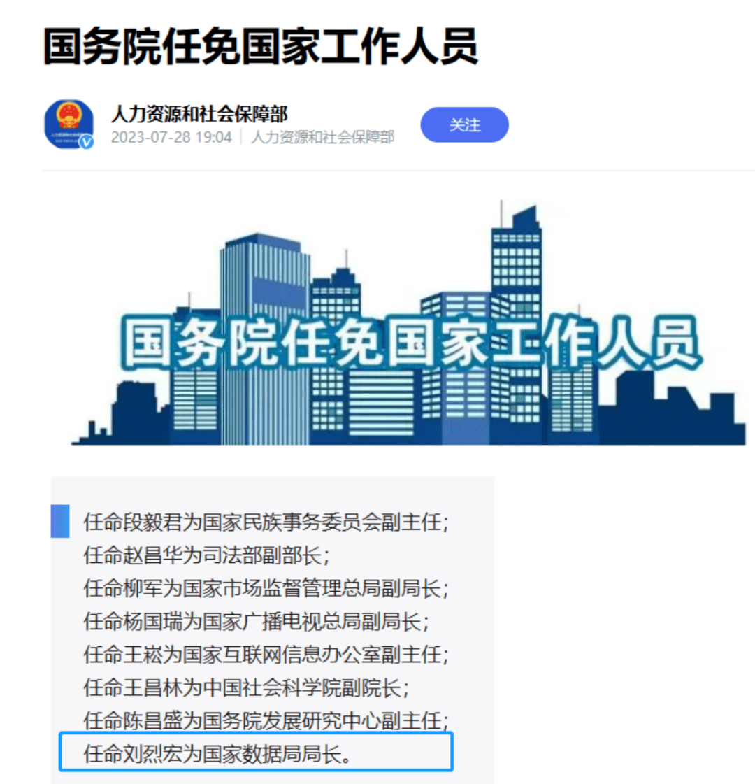 7月28日,人力资源和社会保障部消息显示,国务院新任免一批国家工作人员,其中任命刘烈宏为国家数据局局长。