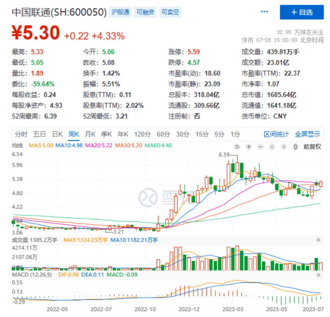 今年以来,受益于算力需求的爆发式增长等因素,三大运营商股价突飞猛进。截至7月28日收盘,中国联通A股股价为5.30元/股,总市值1686亿元。