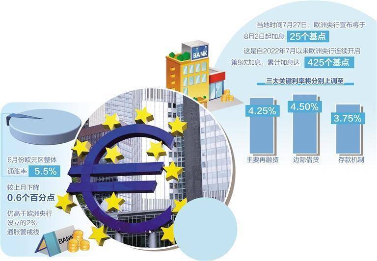 当地时间7月27日,欧洲央行货币政策会议决定,将于8月2日起加息25个基点,主要再融资、边际借贷和存款机制三大关键利率将分别上调至4.25%、4.50%和3.75%。为了确保货币政策调整效果充分传导至货币市场,欧洲央行还决定减少为准备金支付利息,将最低准备金利率定为0。这是自2022年7月以来,欧洲央行连续开启的第9次加息,累计加息达到了425个基点。自此,欧洲央行再度刷新了其史上“最激进”货币紧缩周期的纪录。不过,在此前连续八轮的加息刺激后,第九轮符合市场预期的政策,并未出现意料之外的政策“拐点”,反倒体现出了欧洲央行的审慎政策考量。