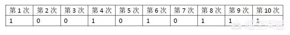 抛一枚硬币,正面和反面是随机的,概率各是50%。我实际的抛了10次硬币,并用1表示正面,0表示反面,列出了一个表格如下: