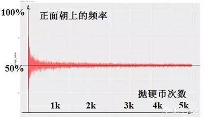 但是随着实验次数的增多,正面朝上的次数就会越来越接近总次数的一半。例如抛一百万次硬币,那么会有接近于50万次正面朝上。如果抛硬币的次数趋近于无穷,那么正面朝上的次数就严格等于抛硬币次数的一半。