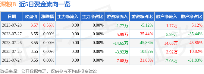 截至2023年7月28日收盘,深粮B(200019)报收于3.57元,上涨0.56%,换手率0.19%,成交量970.0手,成交额34.5万元。