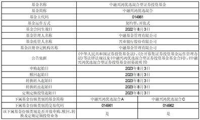 注:(1)以下“中融兴鸿优选混合型证券投资基金”(以下简称“本基金”)由封闭运作期届满开放后更名而来。根据《中融兴鸿优选一年封闭运作混合型证券投资基金基金合同》的约定,本基金封闭运作期自2022年8月3日起至2023年8月2日止,并自2023年8月3日起转为开放式运作,基金名称变更为“中融兴鸿优选混合型证券投资基金”,基金简称变更为“中融兴鸿优选混合”,基金代码不变,申购和赎回费率不变,适用基金合同中关于转为开放式运作后的有关规定,并自2023年8月3日起开放日常申购、赎回、转换和定期定额投资业务。