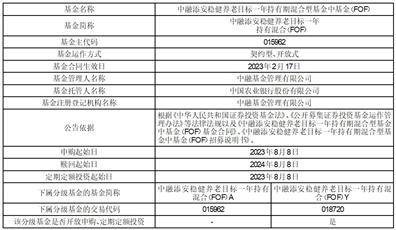 注:(1)中融添安稳健养老目标一年持有期混合型基金中基金(FOF)(以下简称“本基金”)自2023年8月8日起增设Y类基金份额,并自2023年8月8日起开放本基金Y类基金份额的申购和定期定额投资业务。本基金A类基金份额已于2023年5月4日开放日常申购及定期定额投资业务,详见相关公告。