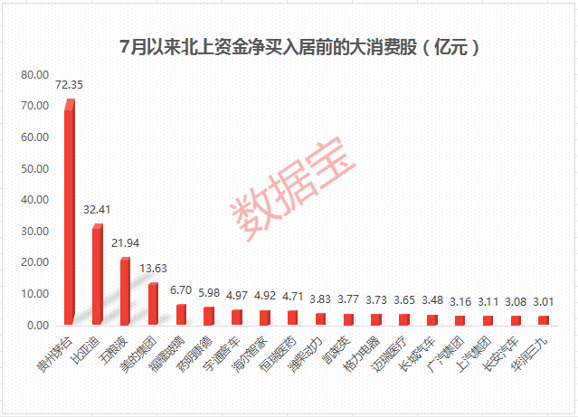 7月以来,北上资金大举净买入贵州茅台、比亚迪、五粮液、美的集团等龙头股,其中贵州茅台买入超70亿元。单周来看,上周北向资金净流入A股最多的个股分别为贵州茅台、宁德时代、五粮液,其中大消费股贵州茅台成为“吸金王”,周内北向资金买入超50亿元。另外,五粮液和比亚迪北上资金净买入分别为19.02亿元、11.3亿元。