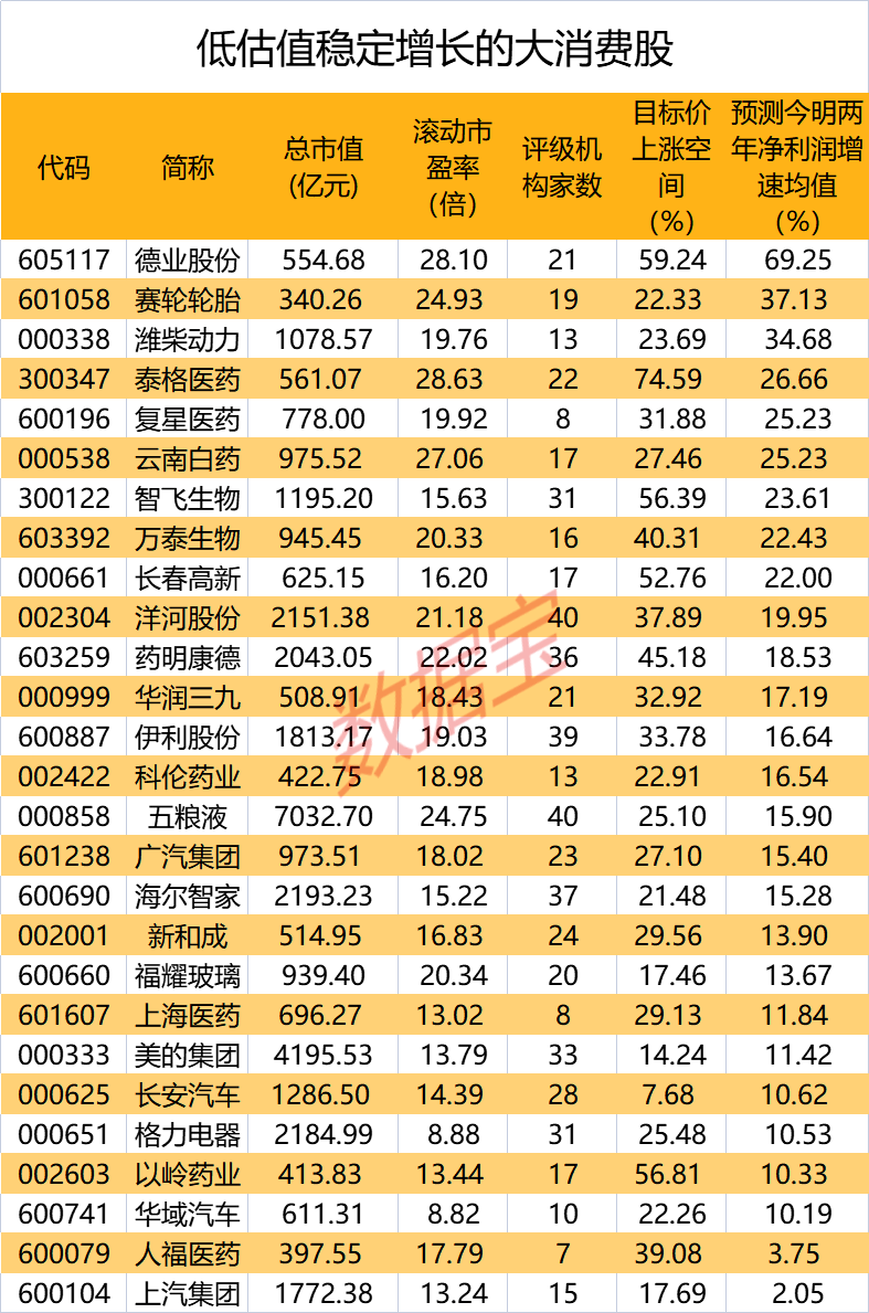 低估值概念股中,按照5家以上机构一致预测,27股今明两年净利润均值有望增长,其中德业股份增速最高。股价方面,泰格医药股价有望涨幅近75%,目标上涨空间最大。