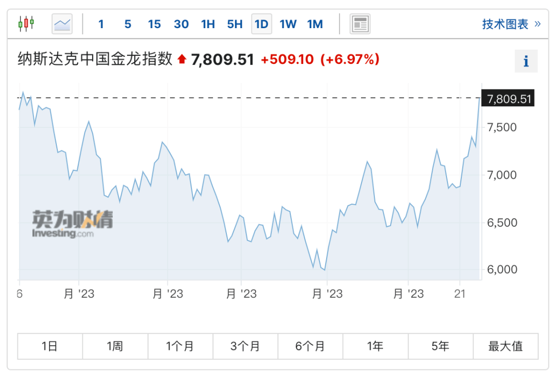 另外,美股市场的中概股“接力”暴涨,上周五晚间,纳斯达克中国金龙指数大涨6.97%,创今年第二大单日涨幅,当周累计涨幅13.59%,相较于5月的最低点,累计涨幅达33.4%,已进入技术性牛市。