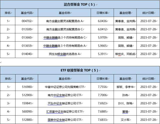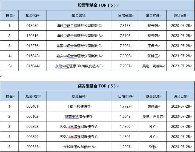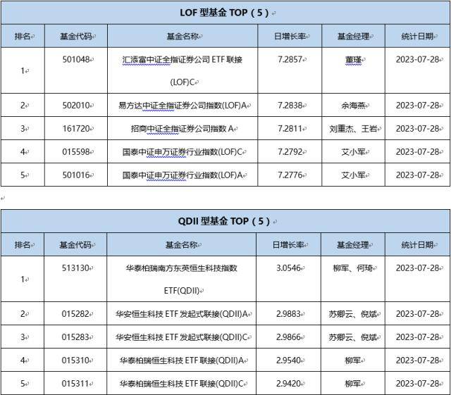 单基金方面,剔除掉 创新封基类型 基金的影响,7月28日业绩表现最好的基金为华富中证证券公司先锋策略ETF,日增长率为7.7556 %,其次为南方中证全指证券公司ETF,日增长率为7.7006 %、天弘中证全指证券公司ETF,日增长率为7.6923 %。