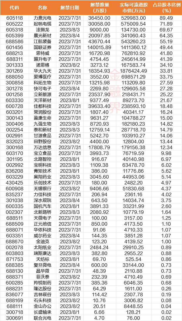 本周解禁数量最多的是EDA龙头华大九天,该公司于7月31日有1.84亿股解禁,占解禁前流通股234.8%,占总股本33.81%,解禁类型为首发原股东限售股份和首发战略配售股份解禁。