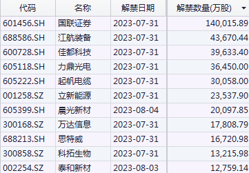 其他解禁数量较大的公司有国联证券(14亿股)、江航装备(4.37亿股)、佳都科技(3.96亿股)、力鼎光电(3.65亿股)、起帆电缆(3.01亿股)、立新能源(2.35亿股)、晨光新材(2.01亿股)、万达信息(1.78亿股)等。