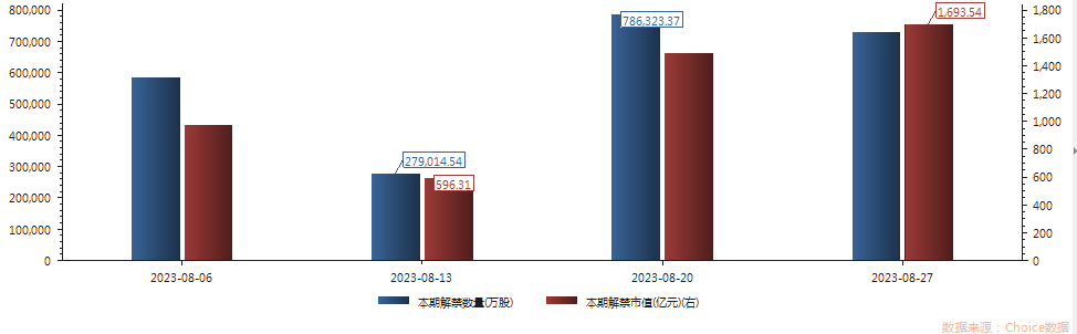 本周(7月31日-8月4日),沪深京三市有52家上市公司涉及限售股解禁,合计解禁量约50.59亿股,按最新收盘价计算,解禁市值为945.35亿元;前一周分别为34.32亿股、861.67亿元。