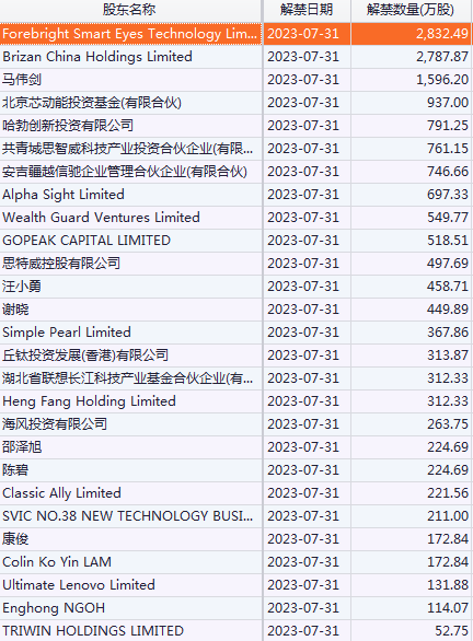 思特威将于2023年7月31日解禁1.68亿股,占总股本比例42.05%,解禁市值约76.28亿元,解禁股类型是首发原股东限售股份。本次解禁股东明细如下: