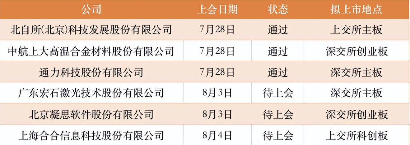 上周(7月24日—7月28日),A股“3过3”,北自科技、通力股份、中航上大皆顺利过会。