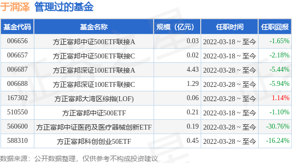 于润泽先生:中国,本科毕业于中南财经政法大学金融工程专业,硕士毕业于纽约大学金融工程专业。2017年5月至2018年7月于上海亚美国际咨询有限公司企业风险管理部担任组合风险分析员;2018年7月至2019年9月于东北证券股份有限公司研究部担任研究员;2019年9月至2021年2月于方正富邦基金管理有限公司指数投资部担任研究员;2021年2月至2022年3月于方正富邦基金管理有限公司指数投资部(指数投资部于2022年3月17日变更为数量投资部)担任基金经理助理。2022年3月18日担任方正富邦中证500交易型开放式指数证券投资基金、方正富邦中证500交易型开放式指数证券投资基金联接基金基金经理。2022年3月28日任方正富邦恒生沪深港通大湾区综合指数证券投资基金(LOF)、方正富邦中证科创创业50交易型开放式指数证券投资基金、方正富邦深证100交易型开放式指数证券投资基金联接基金、方正富邦中证医药及医疗器械创新交易型开放式指数证券投资基金基金经理。