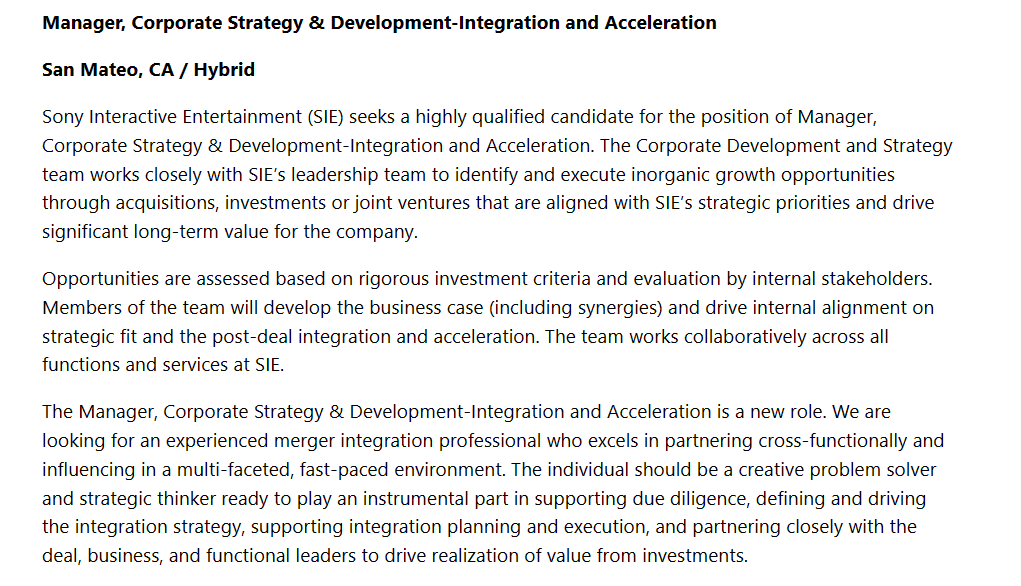 作为公司的发展和战略团队,‘并购经理’要与索尼 SIE 的领导团队密切合作,通过收购、投资或者合资来提高企业业务增长的机会。并且,‘并购经理’要和索尼 SIE 的战略重点一致,为公司带来显著的长期价值。